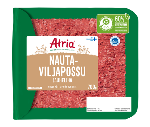 Jauheliharuokiin saa runsasta makua ja miellyttävää täyteläisyyttä, kun käyttää Atrian Nauta-Viljapossujauhelihaa. Pakkauksessa on puolet naudan- ja puolet possunlihaa. Sekoitteen rasvapitoisuus on 20% minkä vuoksi se sopii hyvin pidemmänkin kypsymisen vaativille ruuille koska ei kuivu niin herkästi. Jauhelihan rasvaisuus tuo moneen ruokaan kaivatun mehevyyden. Tästä jauhelihasta onnistut erinomaisesti tekemään makaronilaatikon, lasagnen, lihapullat ja hampurilaispihvit.