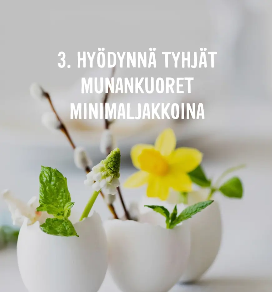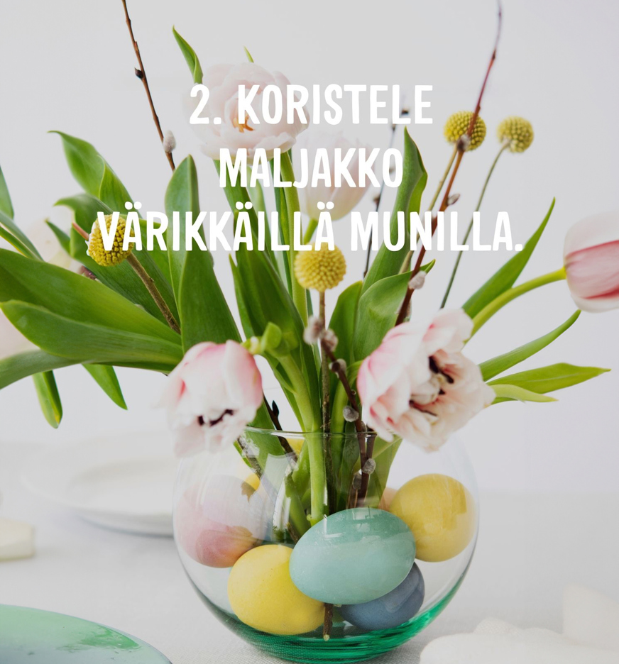 Pääsiäisen kattaus kaipaa värejä. Värien ja keväisen tunnelman luominen onnistuu helposti ilman suuria kustannuksia tai ostoksia, sillä monet koristeet voit tehdä itse kotona. Tästä esimerkkinä ovat pääsiäiseen sopivat kananmunat. Kokeile tänä vuonna yhdistää kananmunia kattaukseesi ja suosi esimerkiksi pöytäliinassa ja serveteissä keväisen raikkaita värejä, kuten keltaista. Nappaa vaikka myös pajunoksia mukaan!